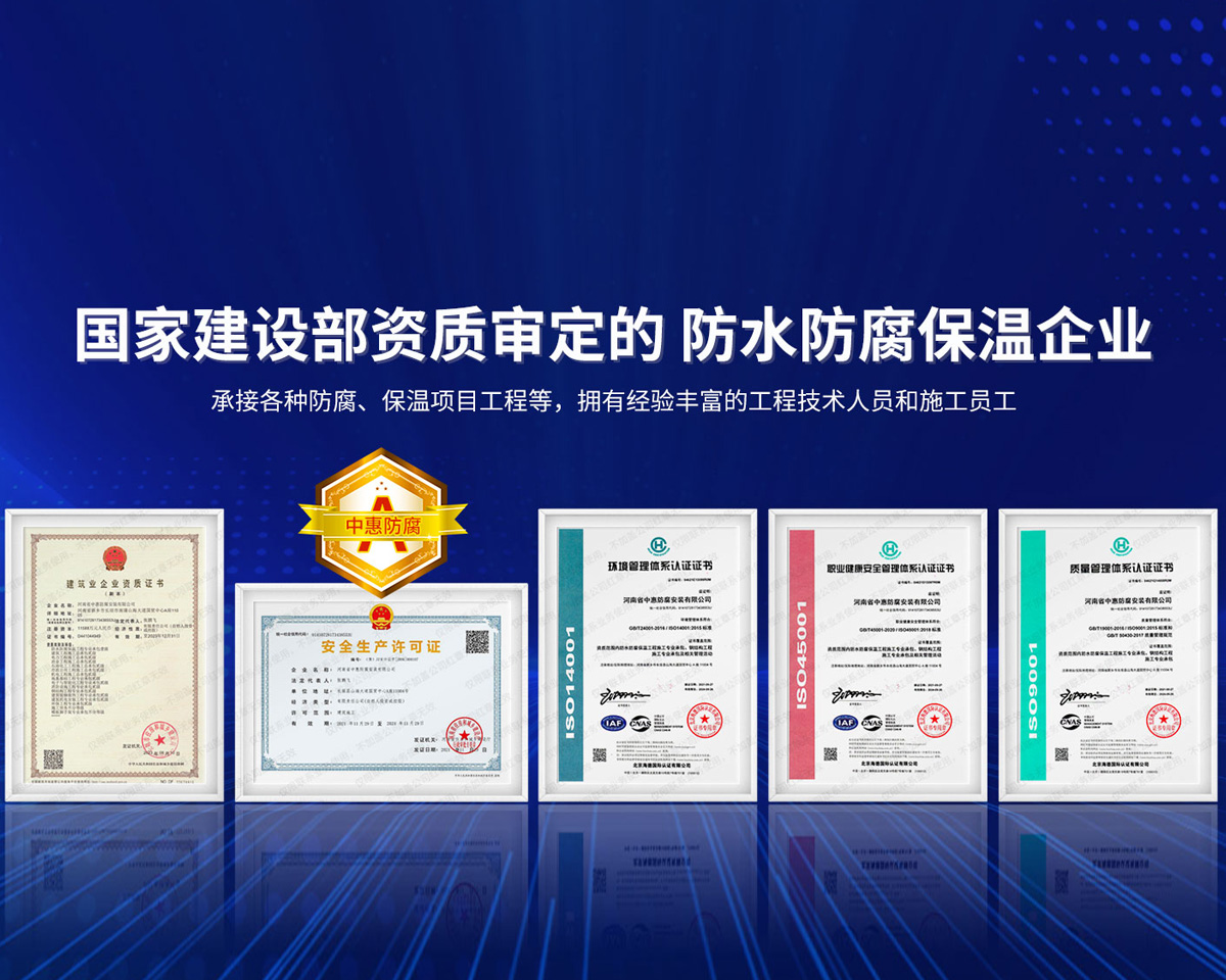 公司經營范圍:防水防腐保溫工程;消防設施工程;建筑裝修裝飾工程;建筑機電安裝工程;電力工程;建筑工程;石油化工工程;工業清洗工程;油罐清洗工程;鋼結構工程;環保工程;模板腳手架工程;電纜防火封堵、防污閃噴涂、外墻外保溫工程;各類施工勞務作業;設備維修、船舶鉚焊、涂裝;電力工程材料、建材、防水材料、防火材料、防腐保溫材料銷售,并相繼通過了GB/T19001-2008idtISO9001:2008GB/T50430-2007質量管理體系認證證書。GB/T24001-2004idtISO14001:2004環境管理體系認證證書。GB/T28001-2011idtOHSAS18001:2007職業健康安全管理體系認證證書。公司是中國防腐蝕于防護協會、中國施工企業管理協會、電力協會和中國鋼結構防水協會會員單位。 公司的經營業務涵蓋了石油、化工、電力、冶金、煤炭、船舶、國防、燃氣、水利、環保、交通運輸、航空及國防軍工和輕紡市政等行業的防腐保溫絕熱設備。鋼結構安裝、防火、防水、金屬噴鍍、聚脲噴繪、陰極保護、防滲透堵漏、玻璃鋼及各種磚版材料襯里、橡膠襯里、煙氣硫和耐酸溶劑腐蝕等工程施工。公司連續十年榮獲“省市先進施工企業”“安全生產先進單位”“重合同,守信用企業”和“AA***資質企業”的稱號。2000年被命名為市級文明單位,2002年被國家工商行政管理局命名為“重合同,守信用的企業”、被中國工業防腐蝕技術協會命名為“防腐蝕企業,能源節約及環境保護領域有豐富的經驗和***的業績。工程一次交驗合格率100%。其中攀枝花鋼鐵公司煉鐵廠四號高爐及熱風爐防腐工程、上海寶鋼公司煤氣柜防腐工程、撫順石油一廠裝置防腐項目、齊魯石化公司稀烴廠高塔防腐工程、吉林化學工業公司煉油廠油罐防腐工程、天津石化熱電廠六號爐頂棚聯絡管保溫工程、大慶油田(太倉)力神泵業工程、中國化學工程第十一建設工程、中原油田勘探局工程、中國石化銷售有限公司華北分部、魯皖輸油管道工程、貴州開磷息烽合成氨工程、陜西黃陵煤化工程、中國石油天然氣西部管道塔里木輸油工程、邯鋼集團邯寶鋼鐵公司煉鐵工程、德州供電工程、吉寶(南通)船廠工程,偃師華潤熱力工程、鄭州熱力總公司。 河南省中惠防腐安裝有限公司愿以豐富的施工經驗,***的技術,***的設備,***的管理,***的服務,竭誠為國內外廣大的用戶提供***滿意、******的工程作品。 我公司愿與國內外同仁一道,團結協作,共同推進防腐蝕行業發展! 公司地址:河南省長垣縣建設路北段360號 固定電話:0373-8866488 郵編:453400 網址:http://www_zhff_com_cn.allin-creatiview.com